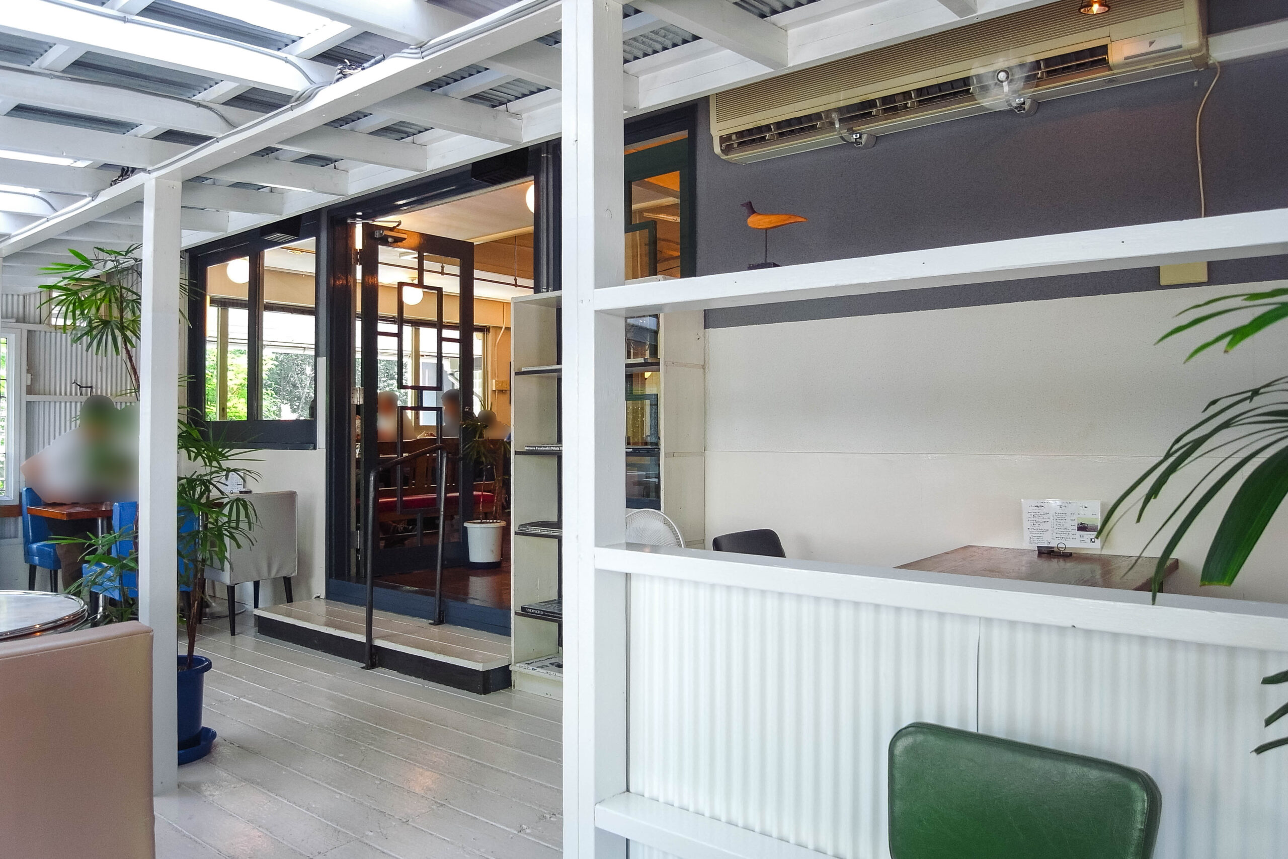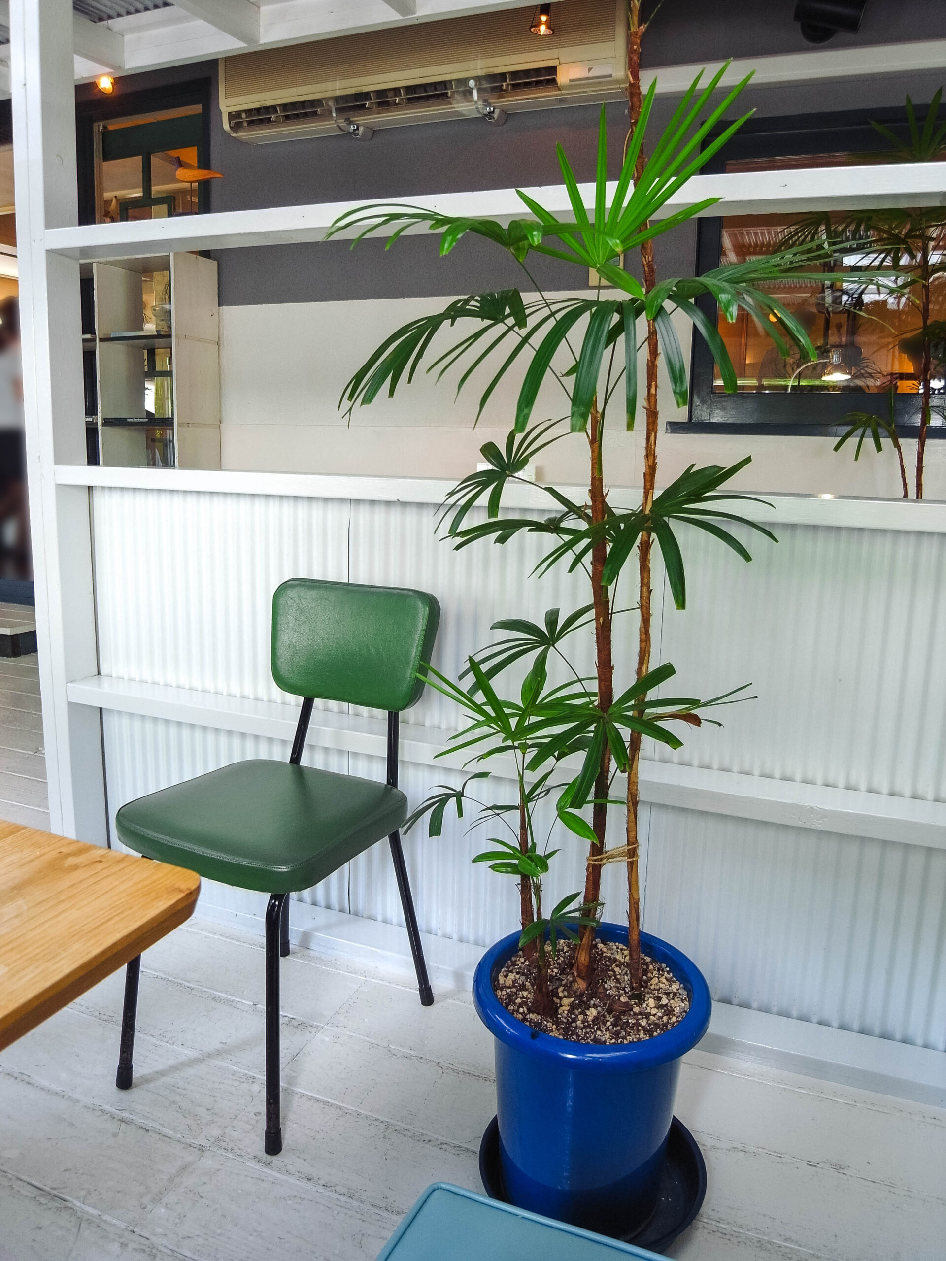 白・木がベースの店内の中、緑・青などの差し色が入っていて明るい雰囲気。