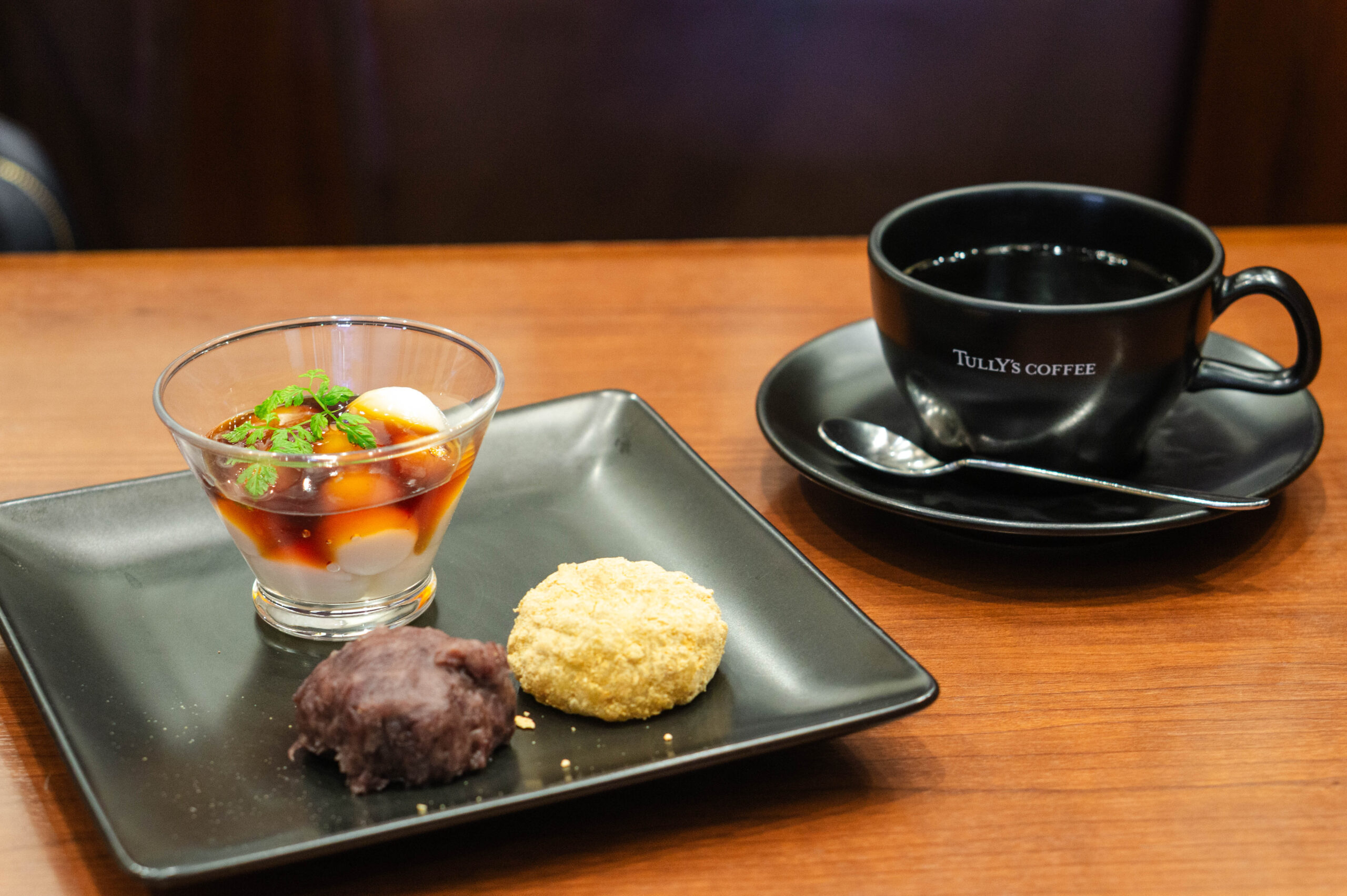 ホットコーヒーと十勝小豆のおはぎとみたらし白玉を注文。