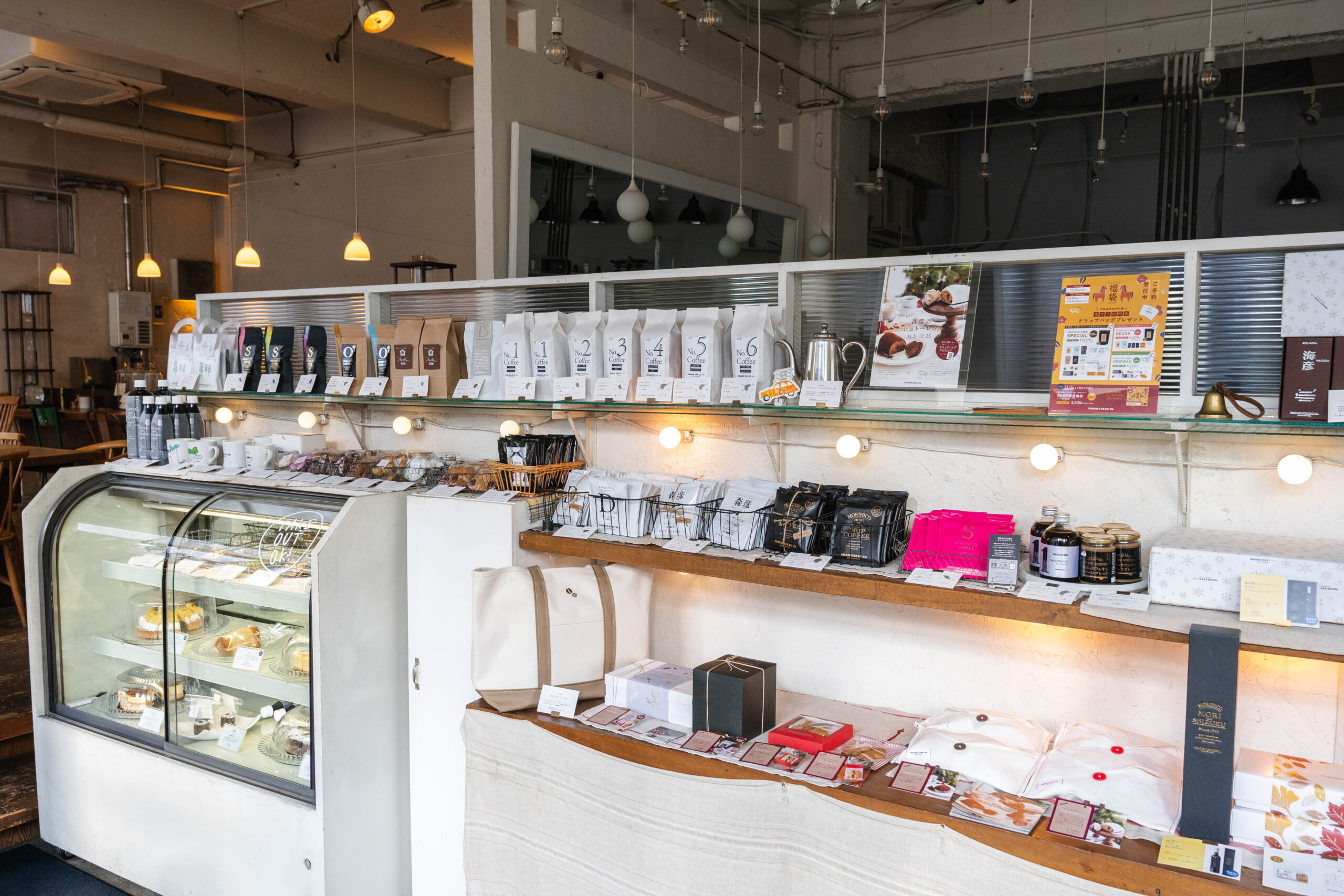 入り口近くにはコーヒー豆やスイーツなどが販売されています。
