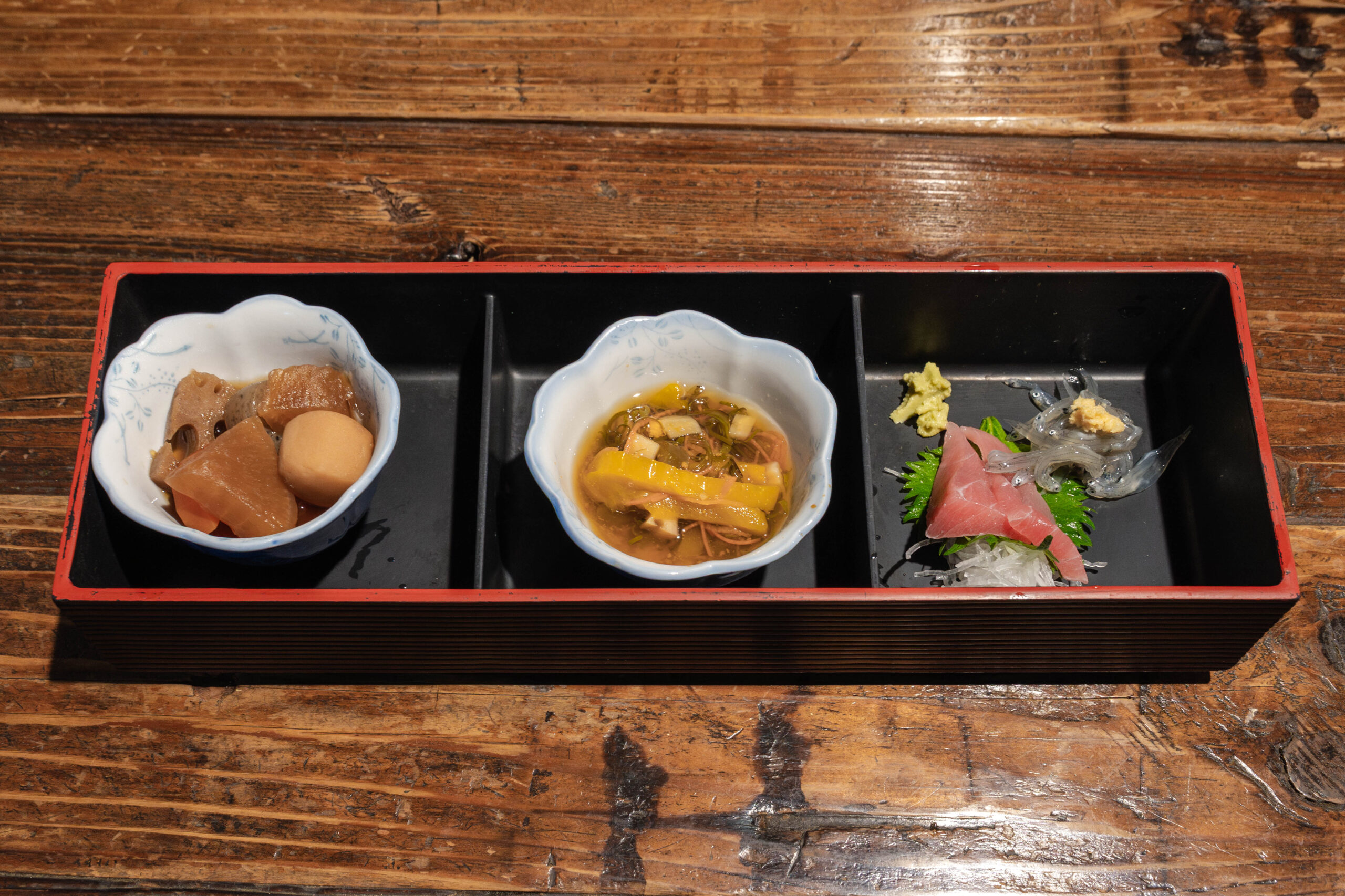 晩酌セットの小鉢2点+お刺身2点。